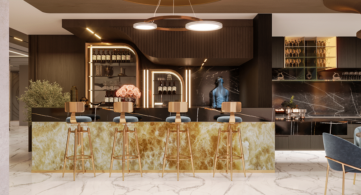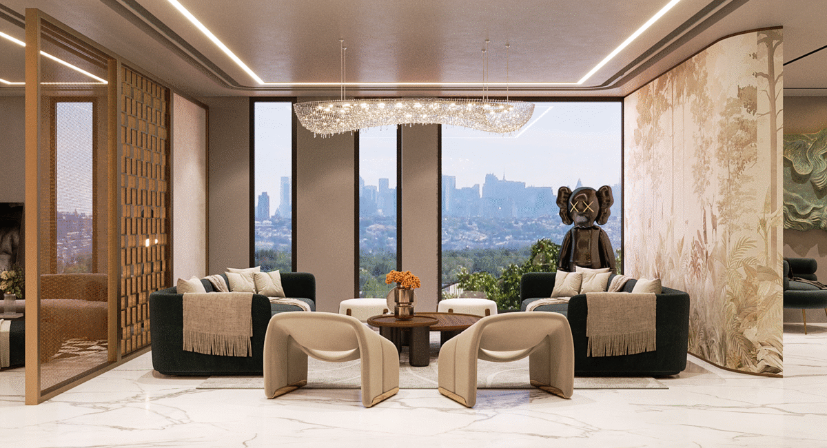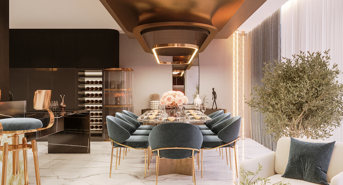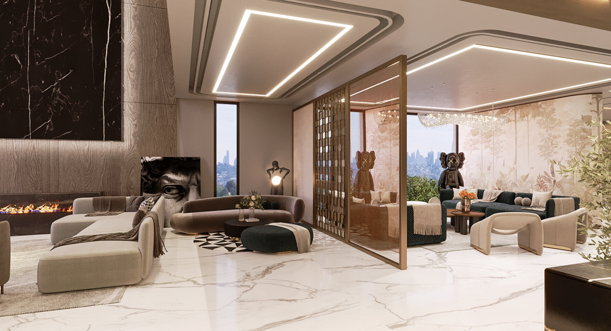 At the heart of the design is a vision of modern luxury that speaks to Dubai’s cosmopolitan lifestyle. The residence exemplifies modernity, where sleek lines, neutral palettes, and open spaces merge with rich textures, stunning finishes, and bespoke elements. The layout focuses on fluidity and openness, allowing natural light to flood the interiors and offer panoramic views of the surrounding city skyline.