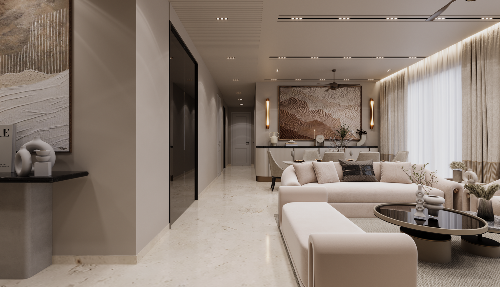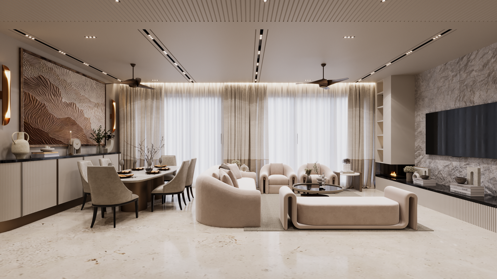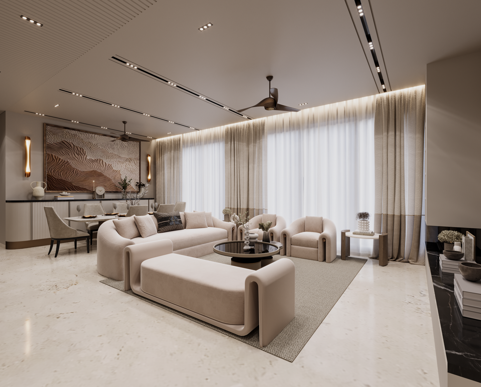 A modern contemporary living and dining featuring soft earthy tones and abundant natural light.