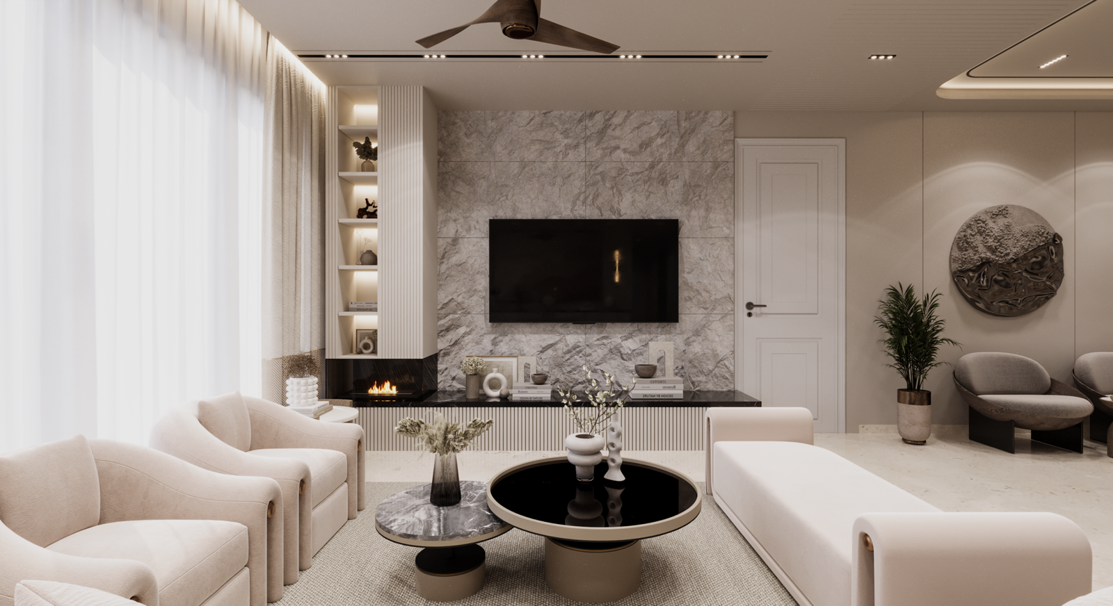 The space is anchored by sculptural, curved seating in warm beige, accented with textured fabric